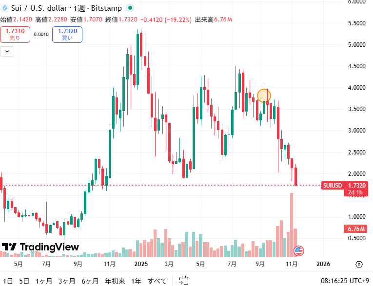 suiが私が購入した3.6ドルから現在は1.7ドルくらいになってしまっています。
