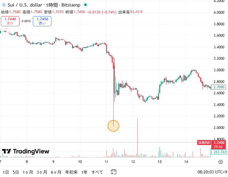 アルトコインはもっと悲惨でした。スイ(SUI)なんかは一時85%も暴落して0.5597ドルまで下がりました。