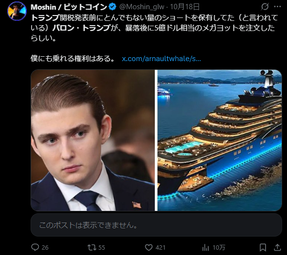 トランプ大統領とバロントランプは莫大な利益を得ましたが、沢山の投資家から奪ったゼロサムゲームになってしまったのが非常に残念です。奪い合いさえなければ誰も退場せず仮想通貨全体が儲けられたのにと悔しい思いがあります。